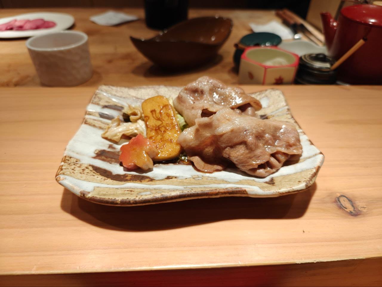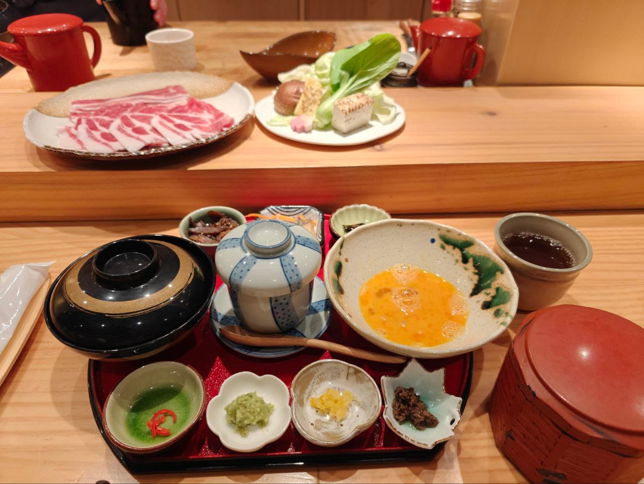 We tried the pork sukiyaki set, which came with appetizers, egg custard, assorted vegetables and dessert. The food will be cooked in front of guests at the counter seats and the serving pace is well-timed. Overall, the quality of the meat was above mark and the vegetables were also not cooked overly soft.