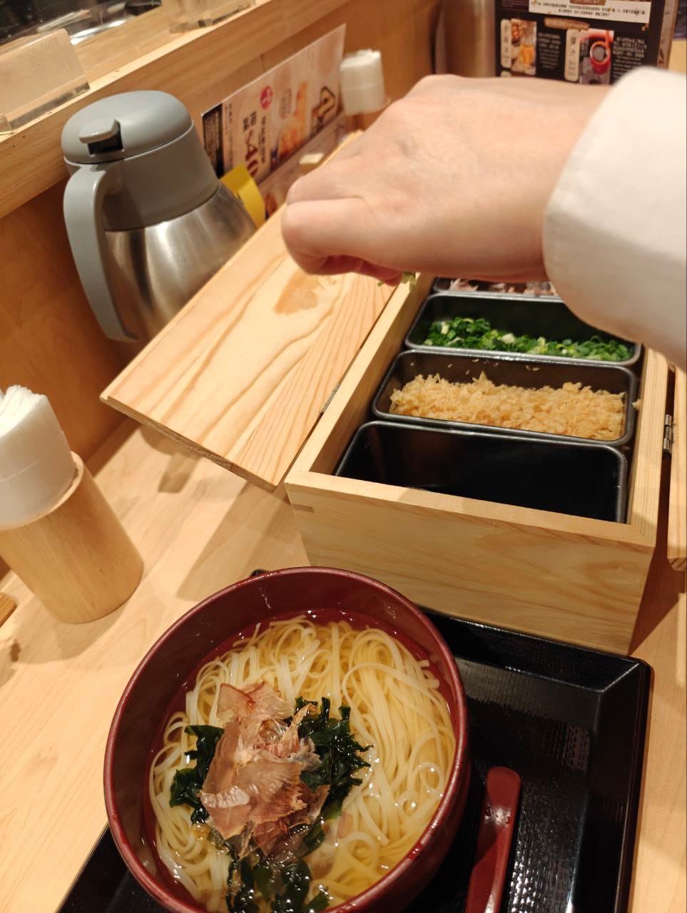 We ordered the scallop set, which was the seasonal menu when we were there. While the rice was pretty average (partly due to higher expectations on our part), the thin udon was tasty. The soup was clear and light, alongside a condiment tray which the staff will bring over for you to go with the udon.