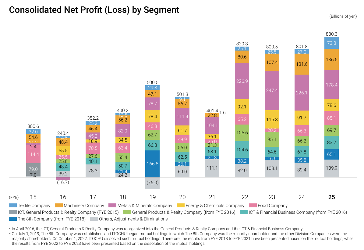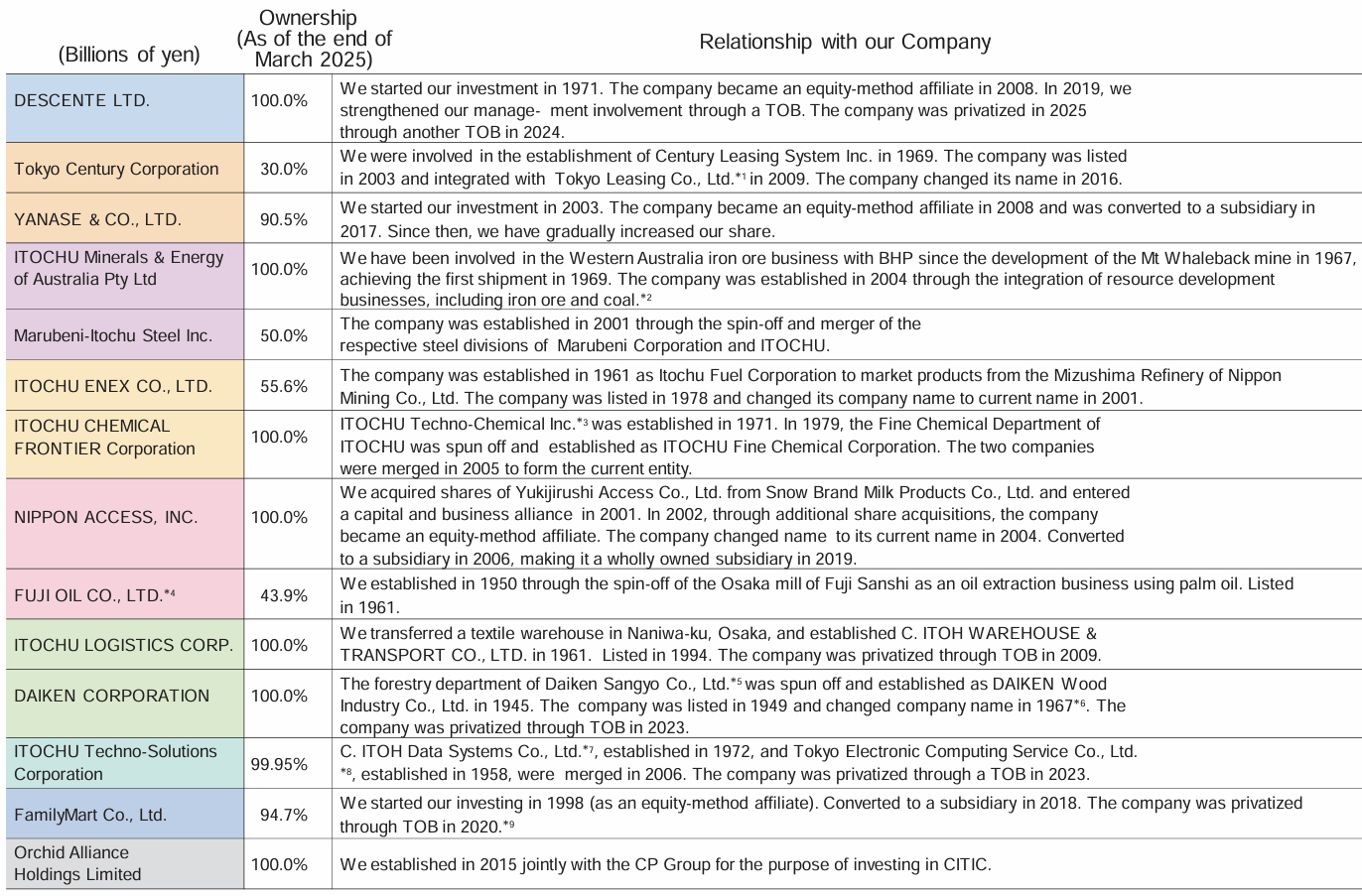 ITOCHU management has embarked on increasing stakes in their subsidiaries on multiple occasions. This allowed them to share in a higher proportion of profits while also having more control over the various businesses. This is evident in the string of tender offers in the capital markets, from FamilyMart in 2020 to CTC in 2023 and the latest major transaction being DESCENTE in 2025.