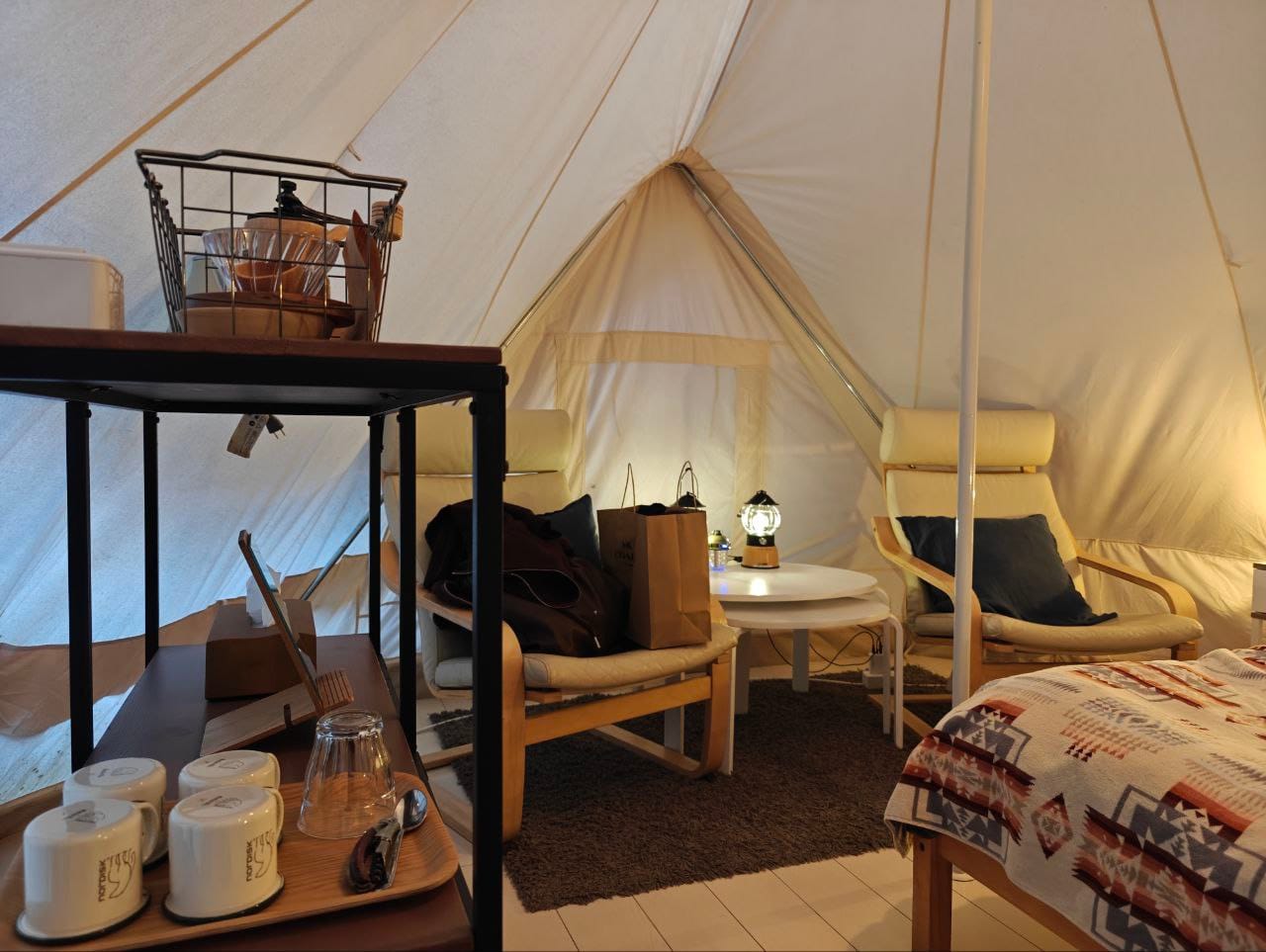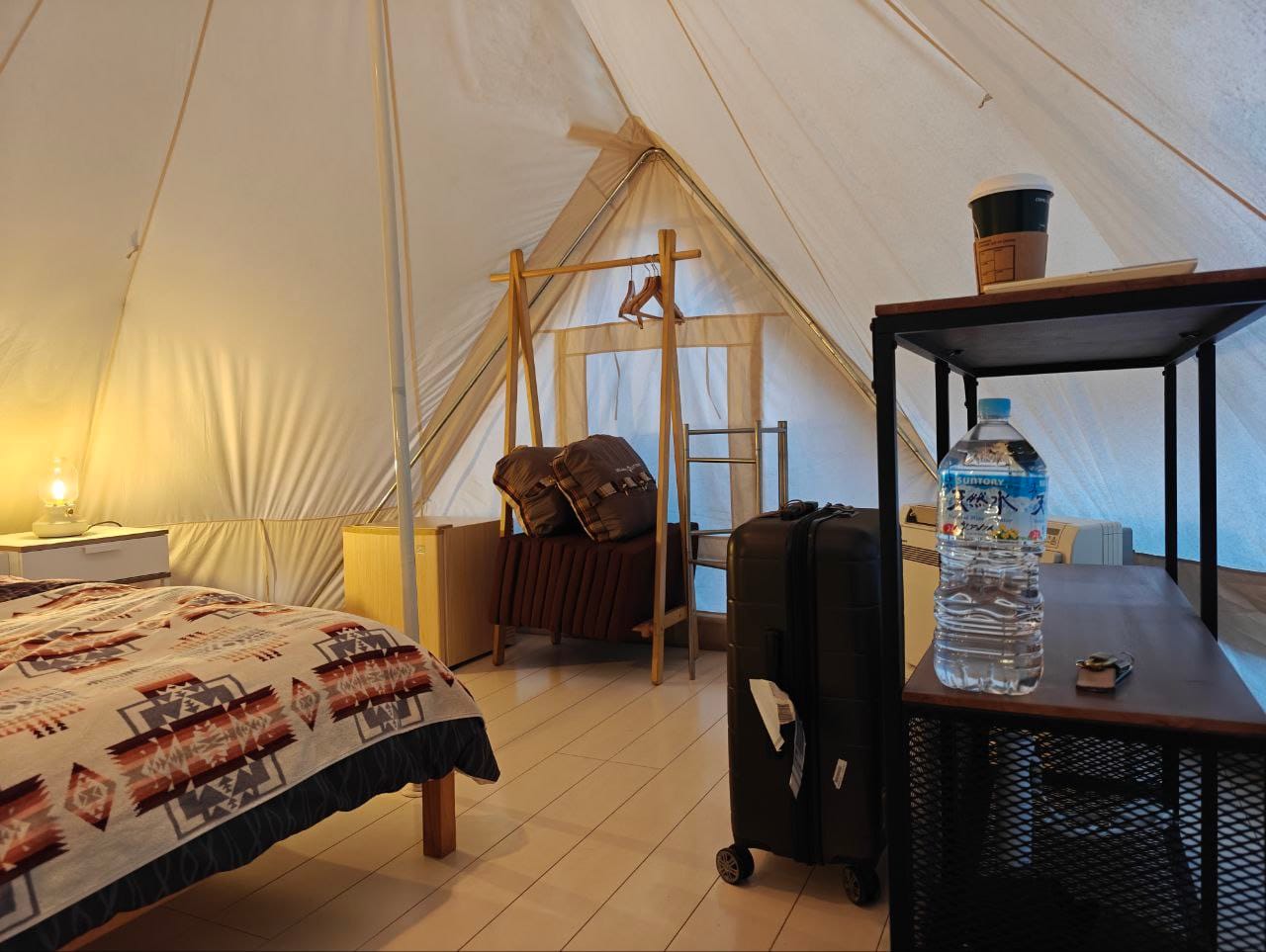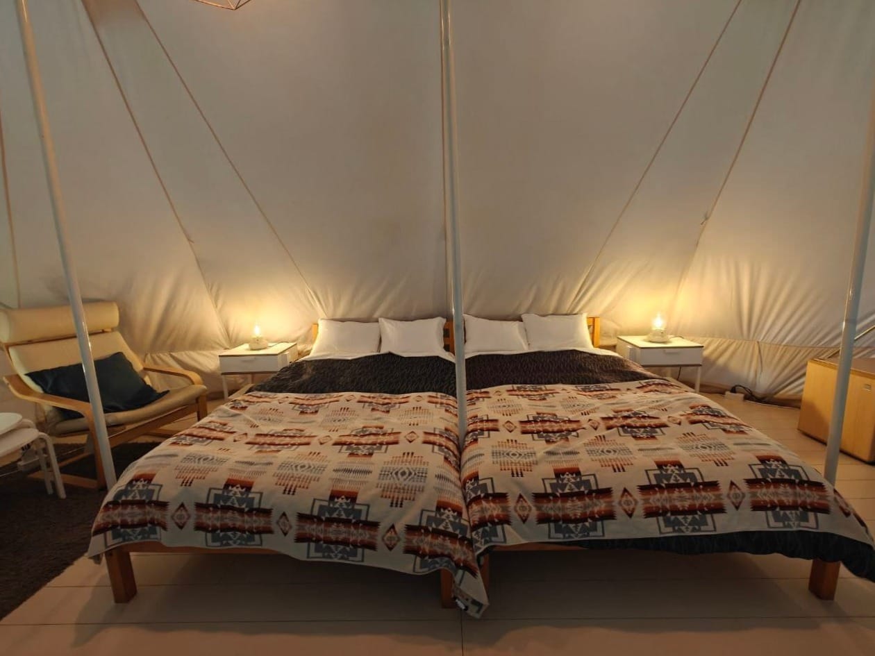 Though unassuming on the exterior, the tent opens to a functional air-conditioned bedroom with a double bed, some storage and a small seating area.