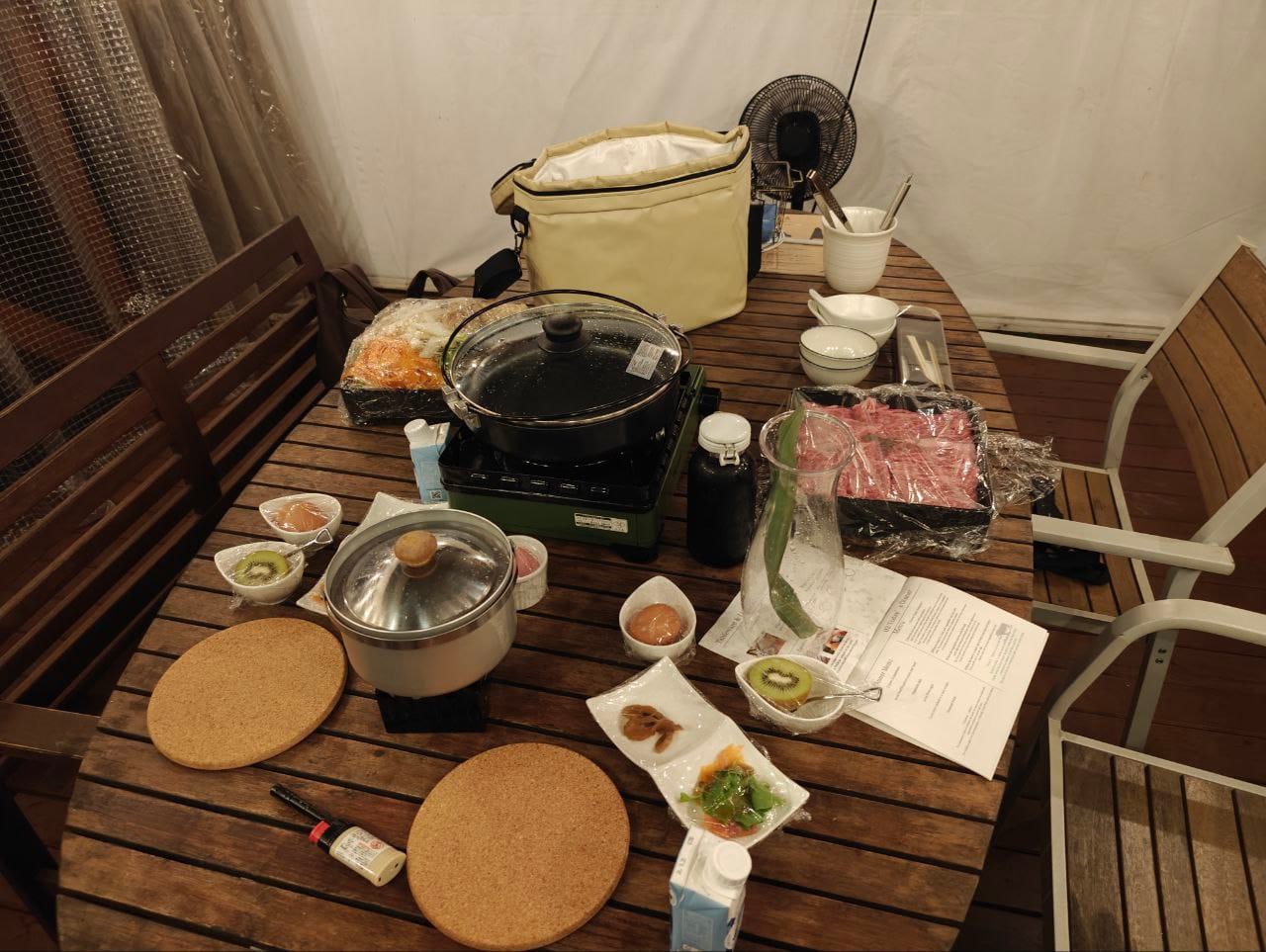 Upon room reservation, guests could purchase a dinner plan to be enjoyed at the private dining area on each glamping deck. Between the wagyu sukiyaki and barbeque option, we picked the wagyu sukiyaki. At the appointed time, staff would bring over all the tools and ingredients needed to complete the dining experience. The friendly staff patiently explained how to prepare the meal and left behind a guide on preparation and cleaning up post-meal as well.