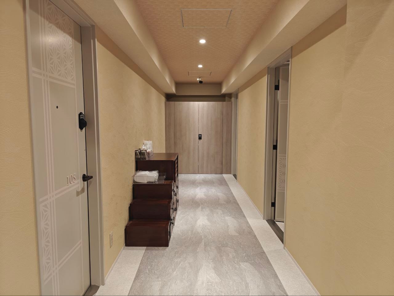 Along the corridor to the room, there is a self-service amenities station furnished with one-time use essentials such as sachets of shower gel, comb, hair tie and bedroom slippers.